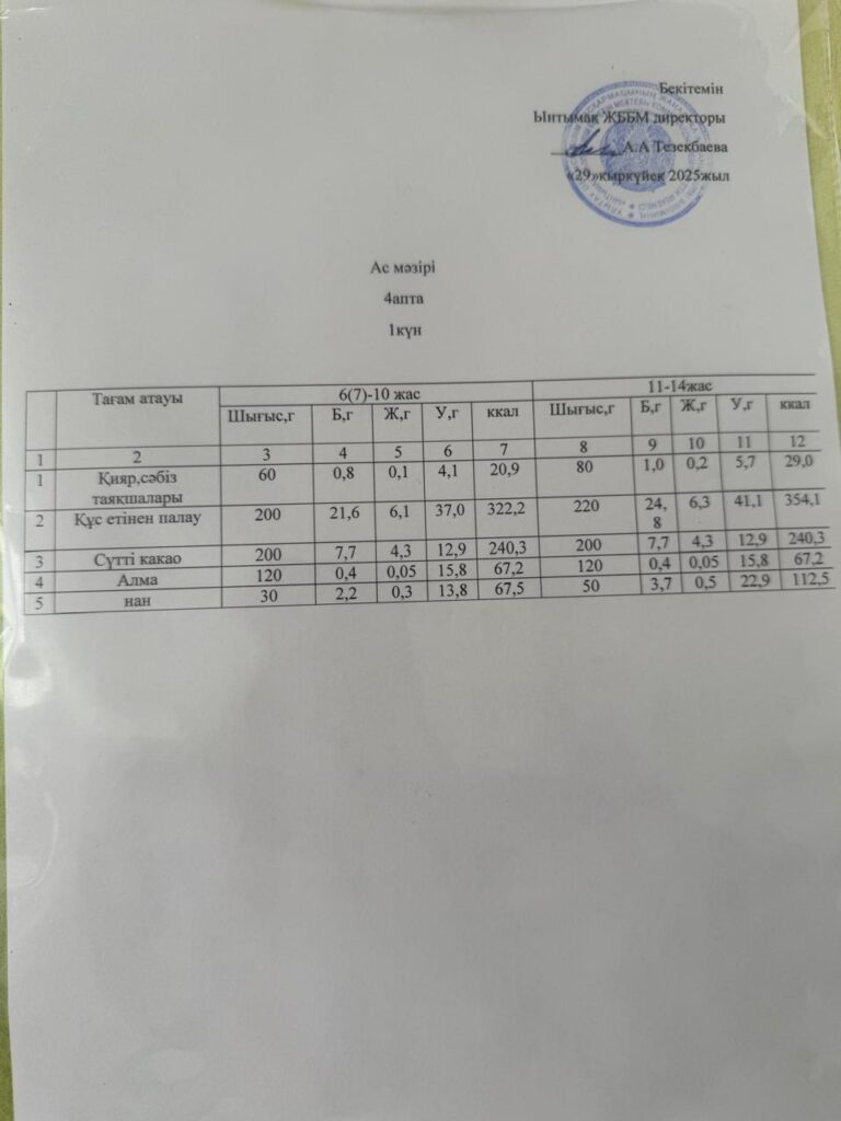 29.09.2025 ж. Ынтымақ жалпы білім беретін мектебінде 1–4-сынып оқушылары мен әлеуметтік санаттағы балаларға мемлекеттік бюджет есебінен ыстық тамақ ұйымдастырылды.